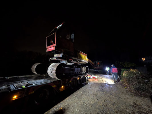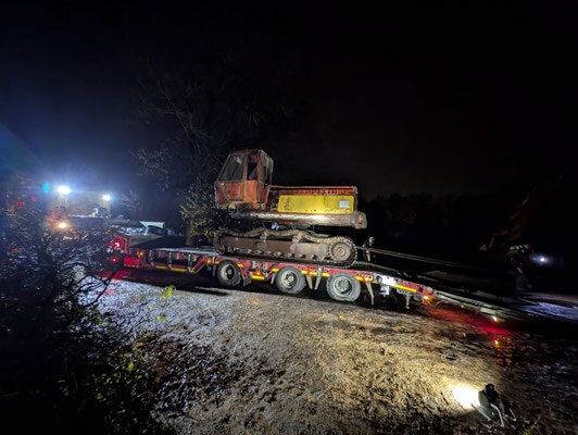Heute wurde der „Organspender“ per Sattelschlepper geliefert. Das Abladen erwies sich jedoch als deutlich kniffliger als erwartet: Beim Aufladen war der Bagger bereits aus seinen eigenen Antriebsketten gelaufen, außerdem besitzt er keinerlei Bremse. Dank erfahrener Unterstützung durch Bauer Thomas Schröder aus Quickborn und Lohnunternehmer Matthias Borkowski aus Langeln gelang die Aktion dennoch sicher und professionell. Nun wird der Neuankömmling Schritt für Schritt zerlegt. Viele seiner Teile werden helfen, Franzis Sennebogen wieder fit für den Einsatz zu machen. Schließlich hat er für den Naturschutz und für die Torfbahn noch viel Arbeit vor sich.