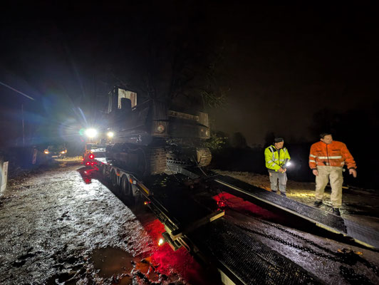 Franzis alter Sennebogen S214 ist seit Februar nicht mehr ganz gesund. Viele Monate lang suchten wir europaweit nach passenden Ersatzteilen – leider ohne Erfolg. Anfang November hatten wir schließlich Glück: In einem Online-Kleinanzeigenportal tauchte ein passendes Spendergerät auf. Einziger Haken – es stand im Westerwald.