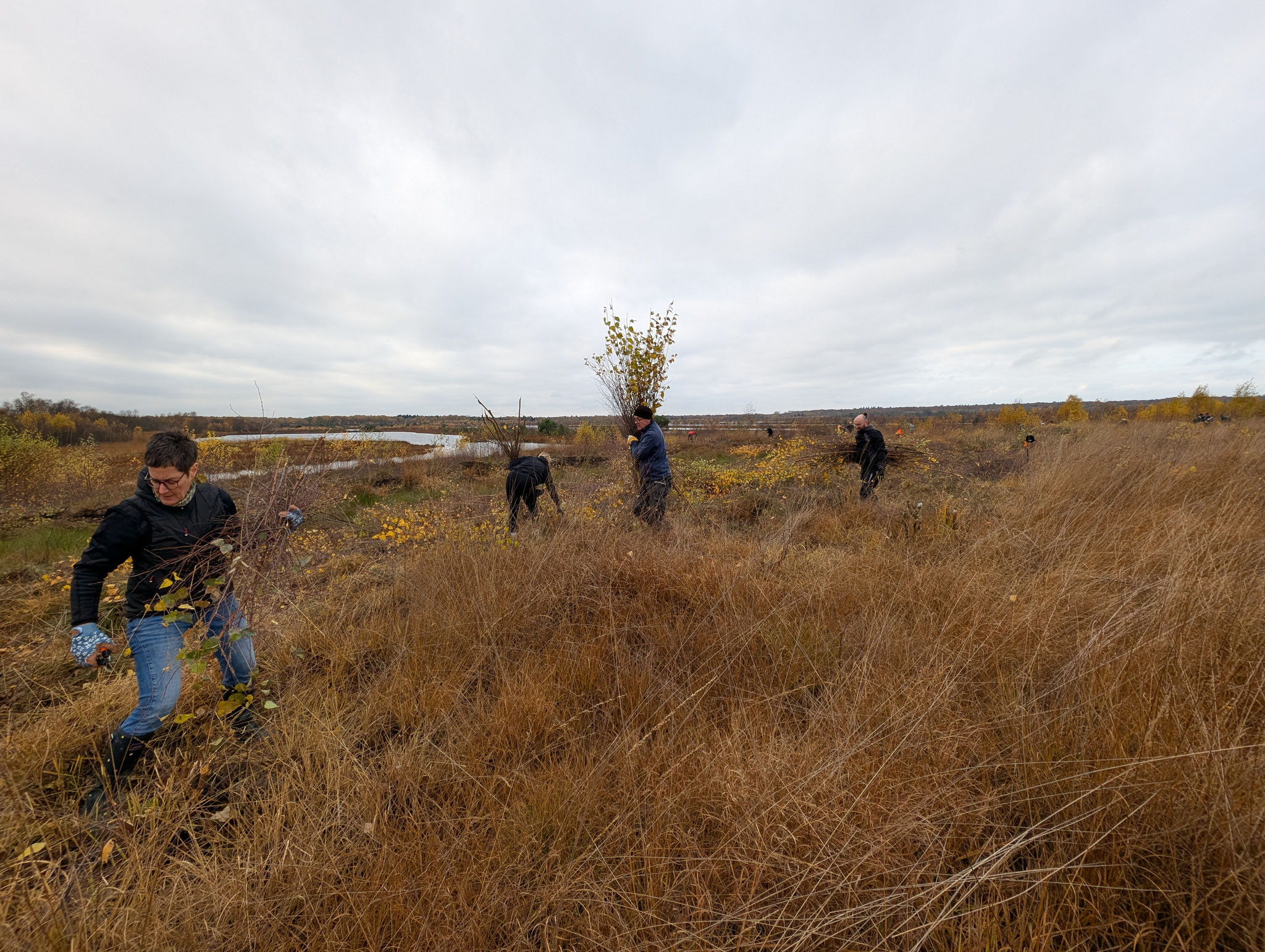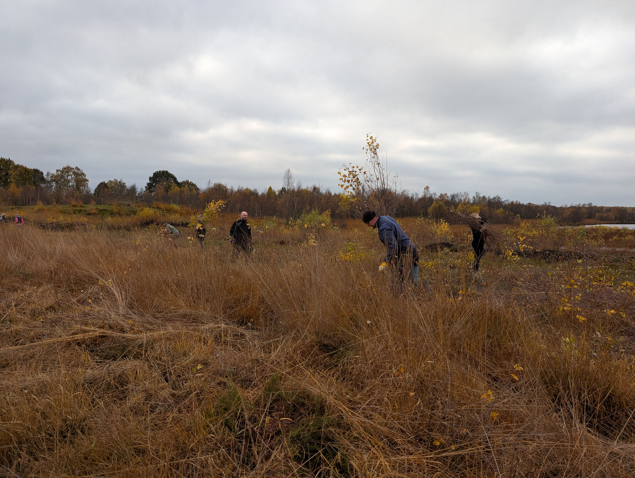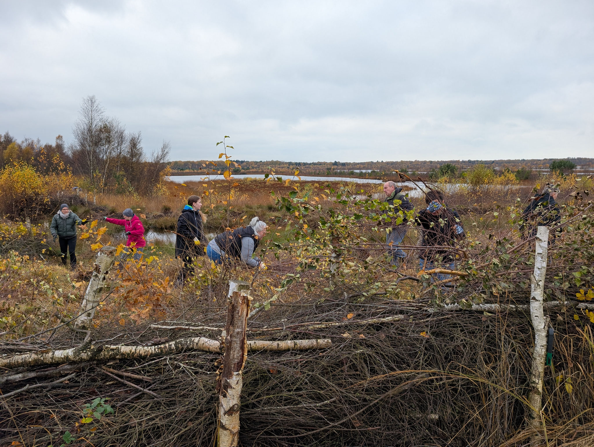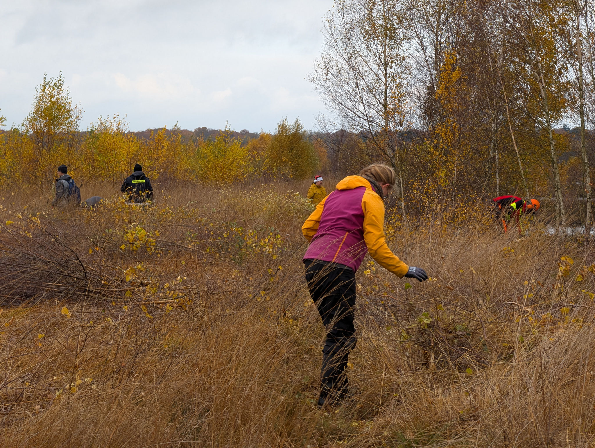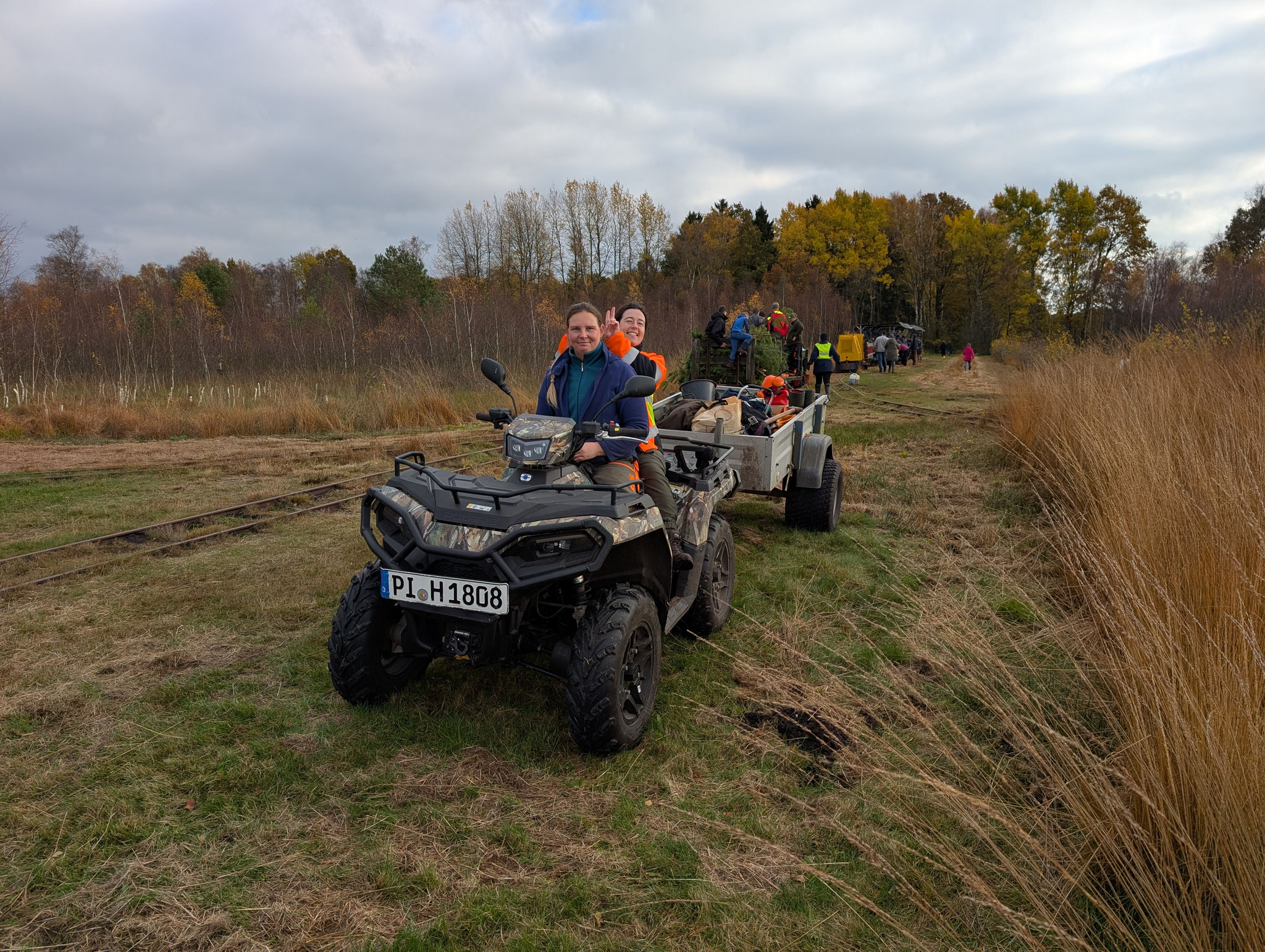 Mit drei Zügen und einem Quad ging es gut gelaunt hinaus ins Himmelmoor. Nach einer kurzen Einweisung machten sich alle tatkräftig ans Werk. Die Aufgabe des Tages bestand darin, junge Birken und Kiefern zu entfernen, damit die offene Moorlandschaft erhalten bleibt und die Bäume dem Moor nicht das Wasser klauen.