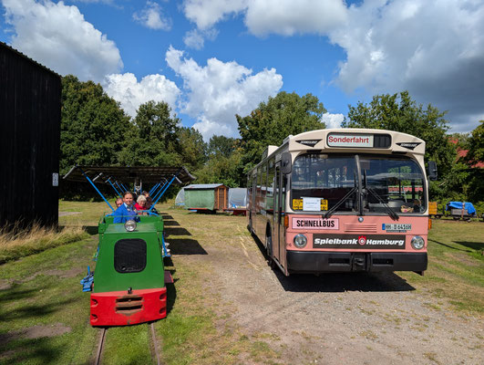 Der Samstag war ein ganz besonderer Tag. Wir durften Peter aus Quickborn begrüßen, Lokführer bei der Deutschen Bahn und sogar Fahrer des ICE. Anlass seines Besuches war ein großes Jubiläum: Peter feierte 40 Jahre Dienstzeit bei der Bahn und hatte zu diesem besonderen Tag seine Kollegen und Freunde eingeladen. Sein Wunsch war es, eine Fahrt mit unserer Torfbahn durch das Himmelmoor zu unternehmen. Für uns war es eine große Ehre, diesen Wunsch zu erfüllen. Die Gäste – allesamt erfahrene Eisenbahner – waren erstaunt, wie einfach, robust und zuverlässig unsere kleine Torfbahn im Vergleich zur hochkomplexen Technik der großen Eisenbahn läuft. Bei bestem Wetter genossen alle die Fahrt, entdeckten viele Naturphänomene und kamen miteinander ins Gespräch. Ganz besonders gefreut hat uns, dass Peter einen Teil seiner Jubiläumsprämie an die Torfbahn gespendet hat. Dafür ein herzliches Dankeschön!