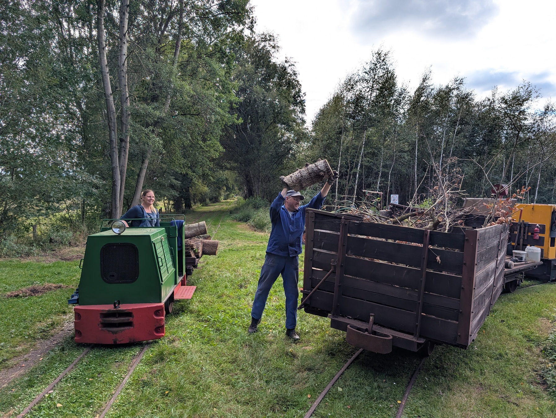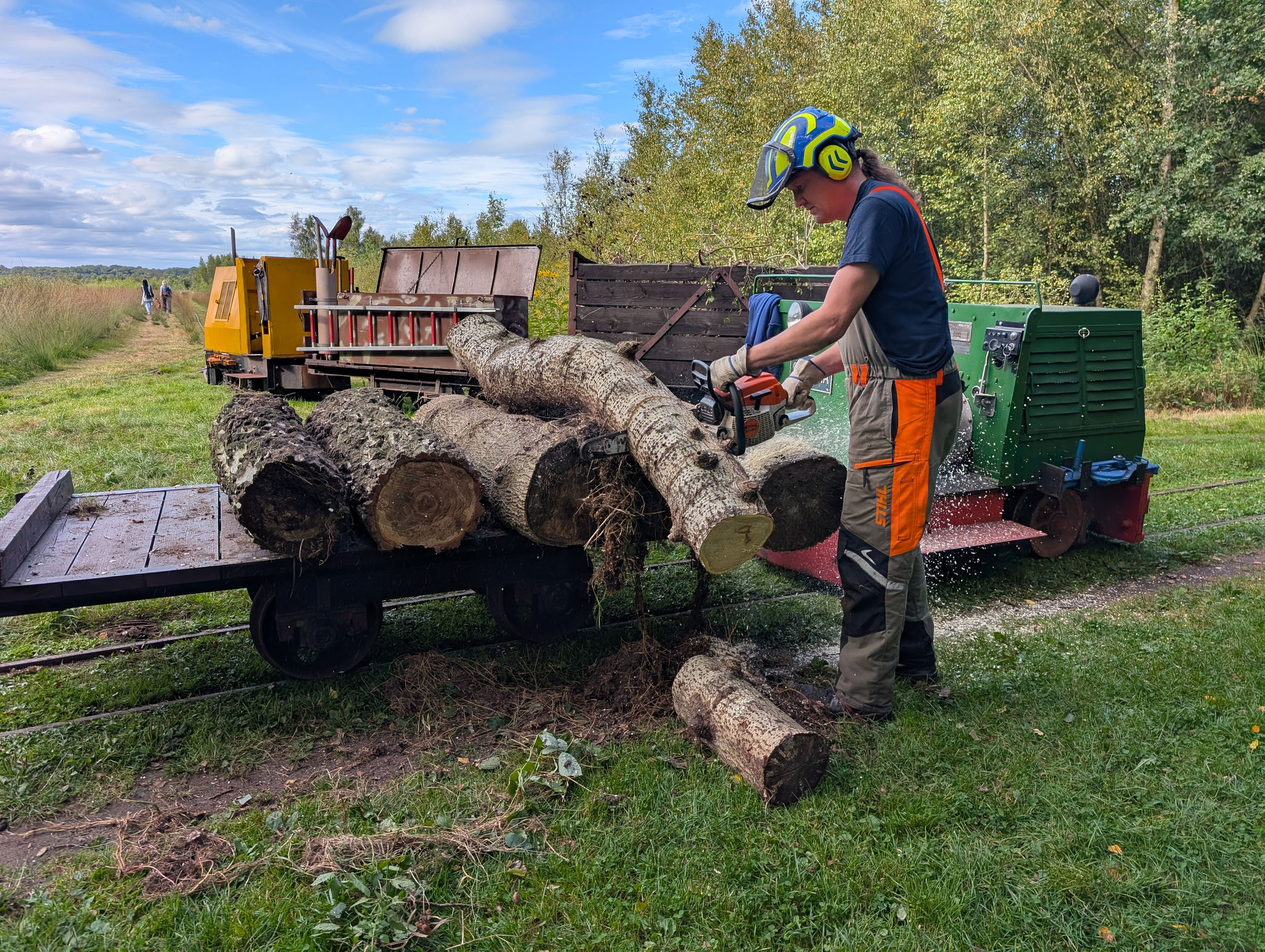 In den vergangenen Wochen haben im Himmelmoor mehrere Bäume unerwartet ihre Standfestigkeit verloren oder sind umgefallen. Um die Sicherheit für unsere Besucher weiterhin zu gewährleisten, mussten diese Bäume entfernt werden. Trotz 26 °C machten wir uns mit Schnittschutzhosen, Schutzausrüstung und dem notwendigen Gerät auf den Weg ins Moor. Unterstützt wurde die Arbeit von unserer Schöma CDL 10, der Jung EL 105, dem Deutz D30 sowie zwei Motorsägen der Marke Stihl. Nach rund fünf Stunden intensiver Arbeit konnten die betroffenen Wege und Gleisanlagen wieder freigegeben werden. Dank des Einsatzes sind das Moor und die Torfbahn für Gäste nun wieder sicher erlebbar.