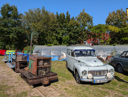 Im Außenbereich findet ein großes Oldtimertreffen statt. Zwischen Loren und Feldbahngleisen präsentieren sich Fahrzeuge vergangener Jahrzehnte – vom klassischen Straßenkreuzer über Traktoren und Baumaschinen bis hin zum Moped.