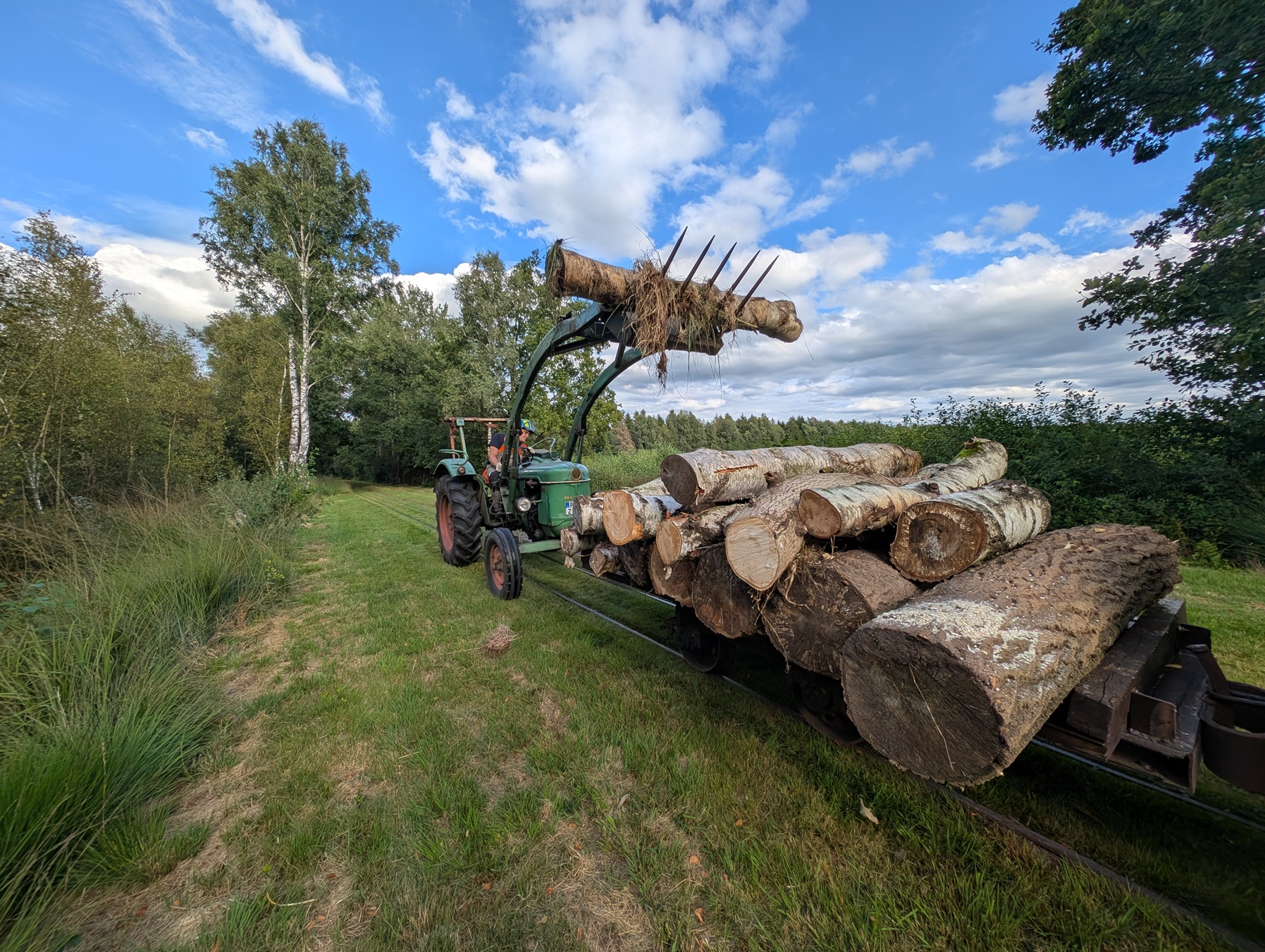 Nach einer geführten Exkursion mit einer privaten Gruppe stand ein weiterer Arbeitseinsatz an: Der Transport von Holz aus dem Moor mit unseren Güterloren – eine eindrucksvolle Kombination aus Maschinenkraft und Naturverbundenheit.
