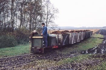 Diesellokomotiven, welche die Loren vom Rand des Abbaugebietes bis zur Torffabrik am Bahnhof zogen.
